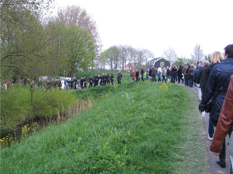 Maar zodra het beeld zijn weg vond in het dagelijks leven van de Oudewatenaren – en dan vooral in de hoofden van bezorgde moeders op weg naar de tennishal ernaast – begonnen de protesten. Ook de Scouting zag het beeld ineens niet meer zitten. Na overleg met de kunstenaar werd besloten het beeld te verplaatsen, en wel een paar honderd meter verderop, op een brede groenstrook aan het water. Op zich een mooie plek. Maar de protesten hielden stand. Met name een aantal lokale (‘invloedrijke’) figuren liet van zich horen en haalde verhaal bij kwaliteitszender SBS6. Ook de net nieuw aangetreden burgemeester – de jongste van Nederland – kwam aan het woord en wist zich niet meteen raad met deze protesten. Zijn voorganger had de protesten dapper weggewuifd en met trots het project verdedigd. BHL1Maar met de wisseling van de politieke macht verdween ook het commitment en het enthousiasme. Met ongetwijfeld goede bedoelingen en om alle voor- en tegenstanders tegemoet te komen, werd bedacht om het paard te omheinen met een struik, waardoor het beeld minder te zien zou zijn vanaf de openbare weg. Een tekstbord geeft de achtergrondinformatie en vertelt dat het een dramatisch beeld is, maar dat het juist ook gaat om een gruwelijke gebeurtenis.
