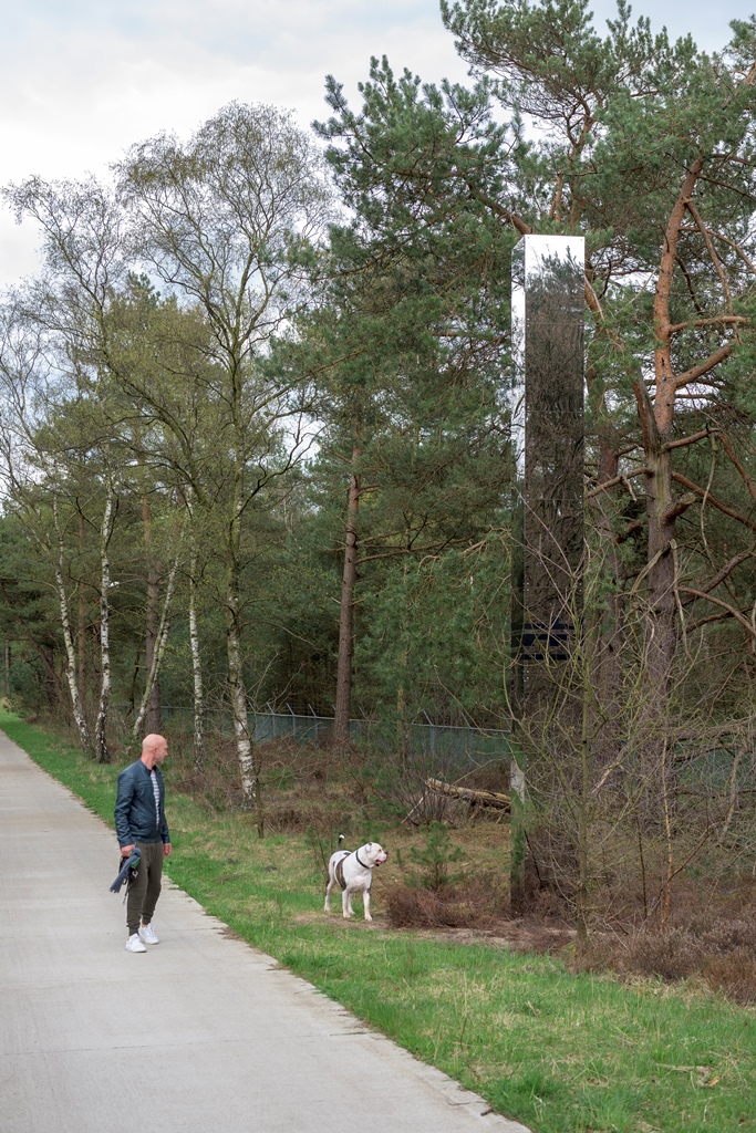 ‘Alleen nog even om misverstanden te voorkomen’, besluit Derksen: ‘Het is nou ook weer niet zo dat Boris Tellegen zich één op één in de sporen van De Stijl voortbeweegt, ook al liggen denkbeelden en het vocabulaire ervan in zijn werk besloten. Het mooie is dat je onderweg de overgang meemaakt van sculpturen die zich tot de stad verhouden, strak en planmatig, en dan weer tot industriële rafelranden, of juist, door de toepassing van verchroomd metaal, tot de high tech wereld van vliegbasis Soesterberg even verderop. En elders voegen de sculpturen zich naar de natuur. Zo stuit je halverwege de route op een opengewerkte zuil, alsof je door abstract gebladerte kijkt. Hier is bosrank en wilde kamperfoelie geplant die zich om het werk heen slingert. Nogal een contrast met zuil nummer één van de tien, die we in 2017 plaatsten in Utrecht: grijs beton met een verzonken reliëf in primaire kleuren bovenin: alsof daar een kleine archeologie van De Stijl prijkt.’