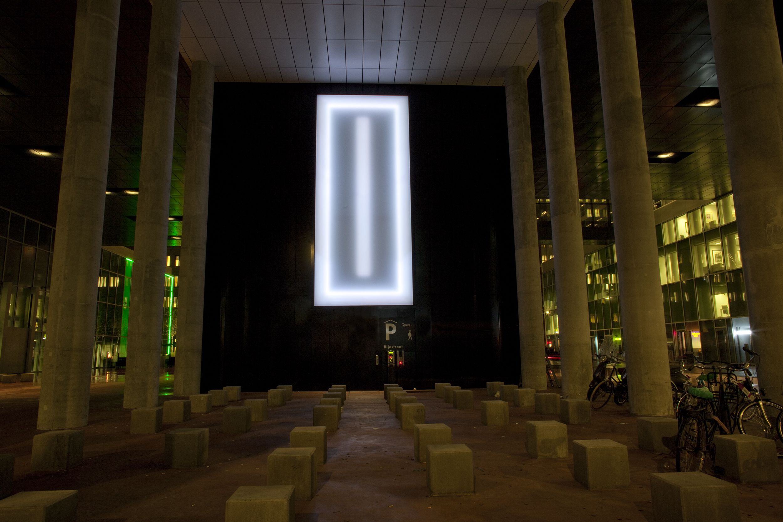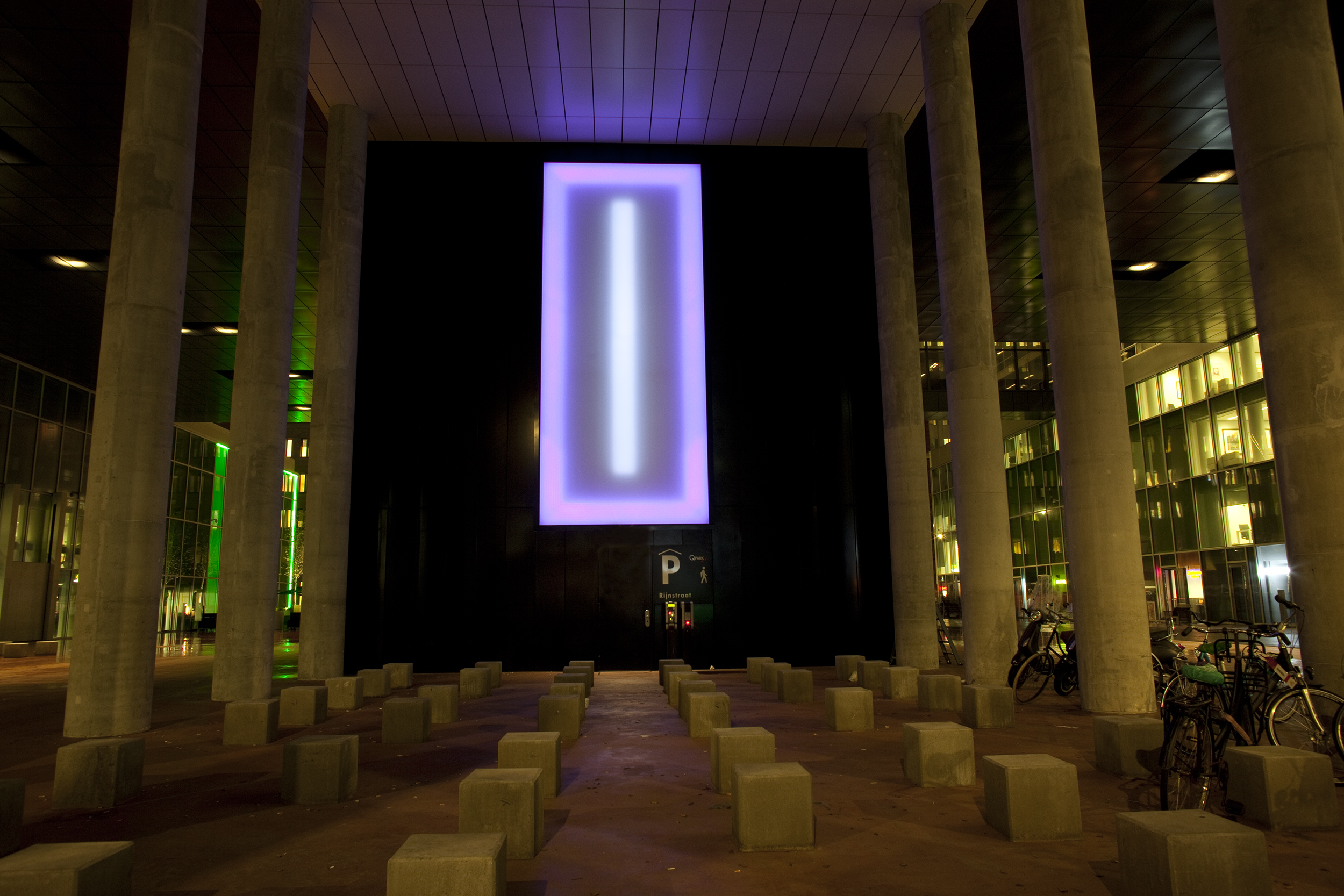 Caelesti Lumine, of ‘hemels licht’ heet het werk van Tamar Frank, dat geplaatst is in een soort nis die wordt geflankeerd door de beide onderdoorgangen en gekaderd wordt door rijen kolommen. De locatie krijgt daardoor een bepaalde concentratie, waardoor je de lichtvlakken die continu traag van kleur veranderen geconcentreerd op je in kan laten werken. De associatie met een kapel doemt verrassend genoeg op, verrassend omdat het een ongelooflijk stedelijke ruimte en gebied is.