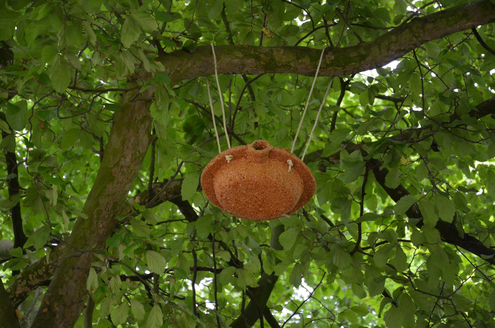 Nestkasten en vogelhuizen dienen er in werkelijkheid natuurlijk eerder toe om vogels naar tuinen en parken te lokken. In de kasteeltuin van Sypesteyn zijn er dan ook talrijke te vinden; van kunstenaars, vormgevers en kunststudenten van de HKU. Zij werden door gastcurator Judith van Meeuwen verleid zich te verplaatsen in vogels. En dat leverde een bonte verzameling op. Zoals conservator Rik van Wegen het mooi verwoordt, worden de vogelhuizen in deze tentoonstelling ‘van faciliteit tot commentaar en verleiding’. Hoewel een aantal daadwerkelijk de potentie heeft als vogelhuis te zullen worden gebruikt, zijn de associaties, idealen en droombeelden van de ontwerpers vooral voor de mens van toegevoegde waarde. Een vogel zal zich niet beseffen dat hij zich in een Duitse bunker bevindt, of in een nest van geperste houtsnippers, in een haspel of bewakingscamera. Het levert wel een aantal heel verrassende beelden op, waarin issues als veiligheid, controle, hergebruik van materiaal, religie en territoriumdrift zijn terug te vinden.