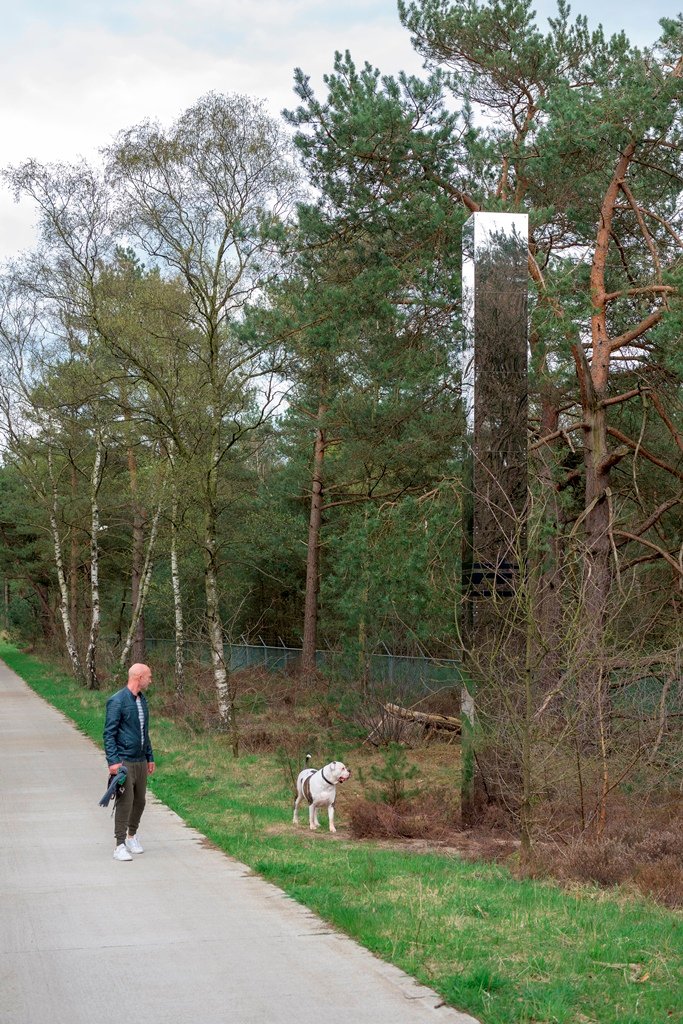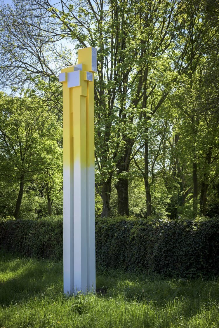 ‘Alleen nog even om misverstanden te voorkomen’, besluit Derksen: ‘Het is nou ook weer niet zo dat Boris Tellegen zich één op één in de sporen van De Stijl voortbeweegt, ook al liggen denkbeelden en het vocabulaire ervan in zijn werk besloten. Het mooie is dat je onderweg de overgang meemaakt van sculpturen die zich tot de stad verhouden, strak en planmatig, en dan weer tot industriële rafelranden, of juist, door de toepassing van verchroomd metaal, tot de high tech wereld van vliegbasis Soesterberg even verderop. En elders voegen de sculpturen zich naar de natuur. Zo stuit je halverwege de route op een opengewerkte zuil, alsof je door abstract gebladerte kijkt. Hier is bosrank en wilde kamperfoelie geplant die zich om het werk heen slingert. Nogal een contrast met zuil nummer één van de tien, die we in 2017 plaatsten in Utrecht: grijs beton met een verzonken reliëf in primaire kleuren bovenin: alsof daar een kleine archeologie van De Stijl prijkt.’